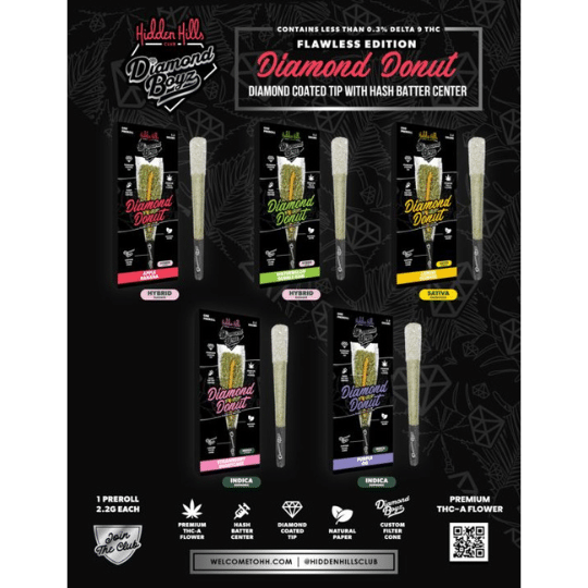 2.2G Diamond Donuts are premium THCa infused pre-rolls crafted with high-quality indoor flower, coated in concentrated extract, and finished with a diamond infusion for elevated potency and slow, even burn performance. Each 2.2-gram donut delivers terpene-rich flavour, dense smoke production, and a strain-specific profile — making it a standout choice for consumers seeking a high-potency THCa pre-roll experience.